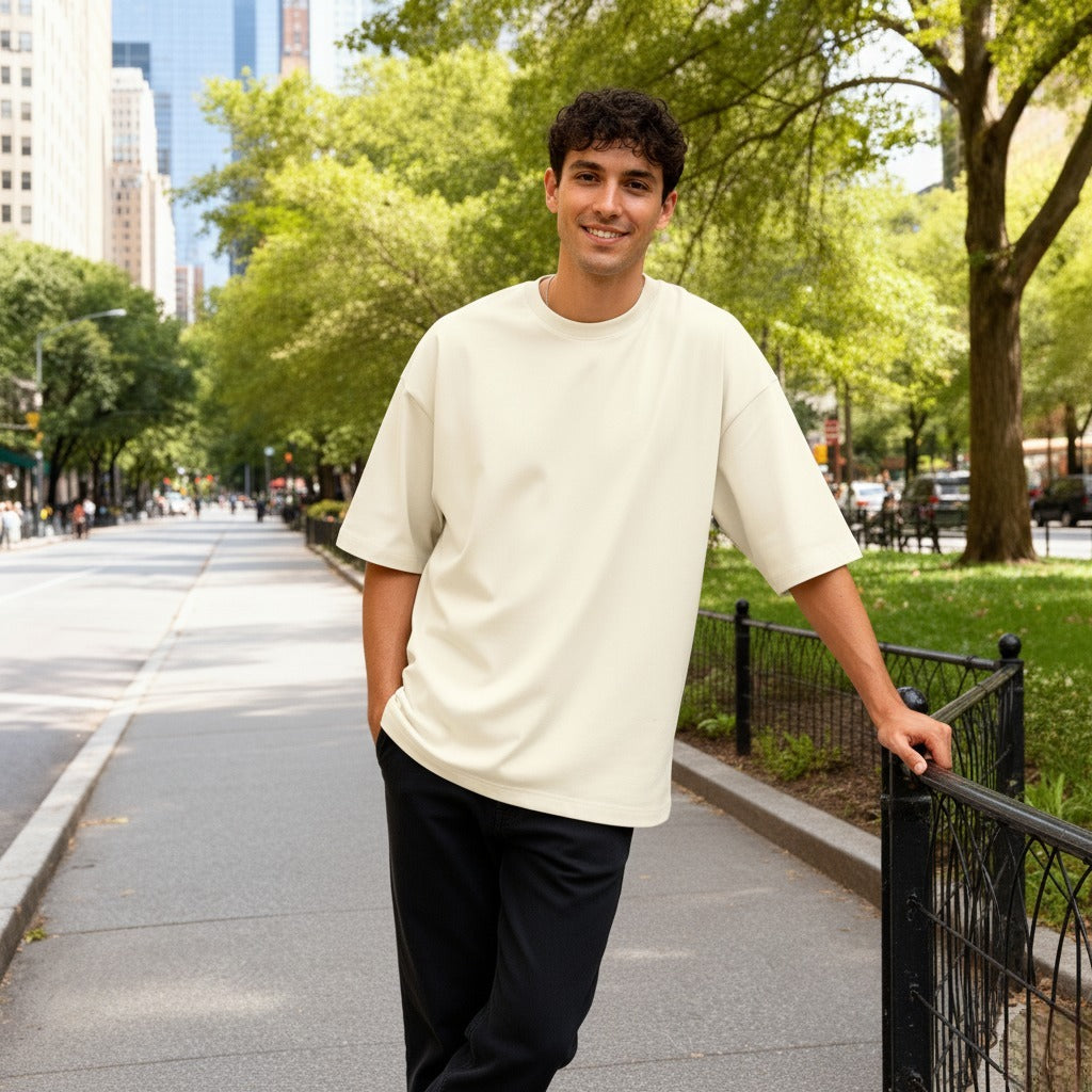 It is a Back Side Design Oversized Tee. Constructed from a 90/10 cotton-polyester blend with a 260 GSM terry-knit texture, this tee offers a superior, soft touch. Designed with a unisex oversized silhouette featuring drop shoulders, it provides a comfortable, relaxed fit that stays stylish.