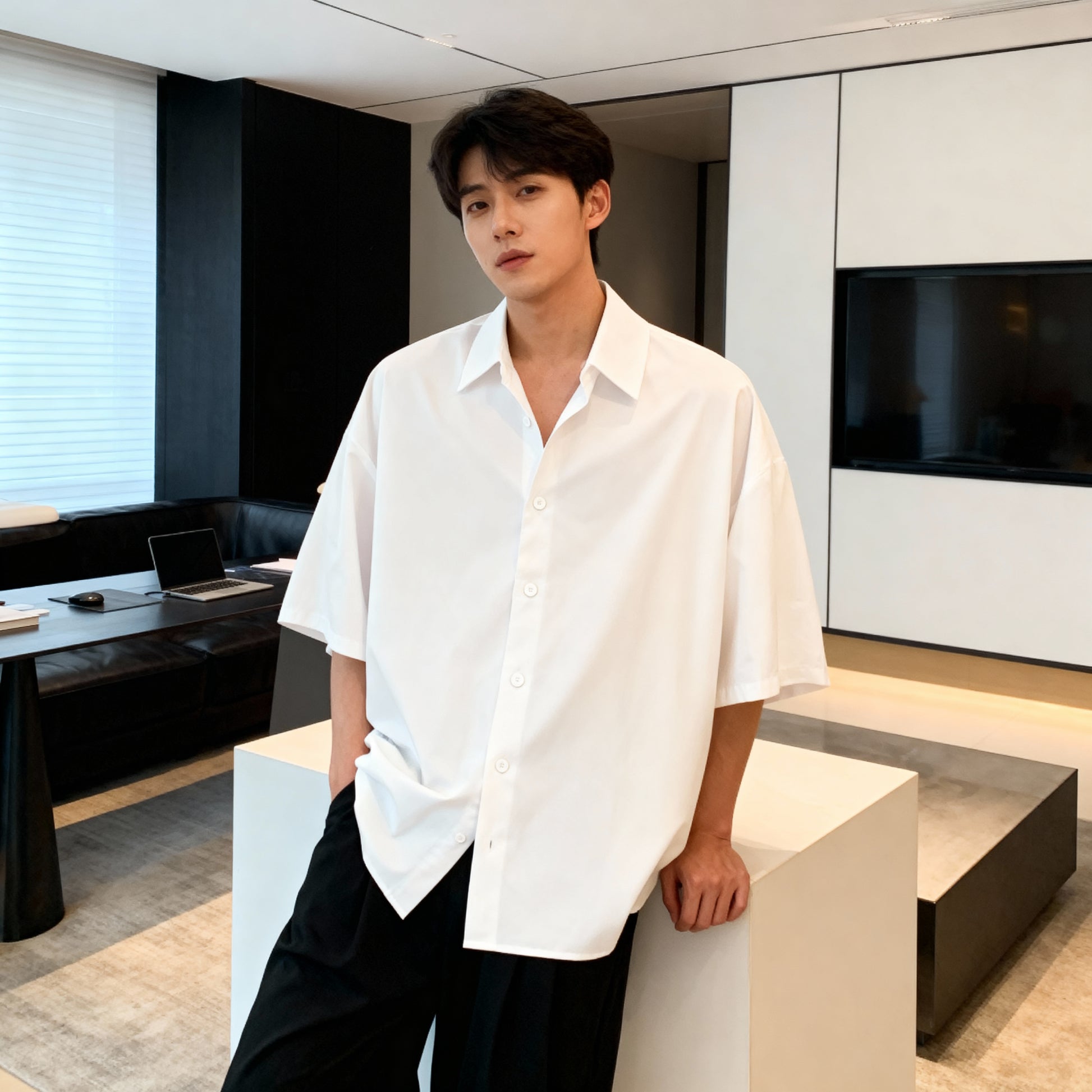 This garment features a crisp, structured yet easygoing feel, crafted from 100% cotton with a 240 GSM weight. The fit is oversized, complete with half sleeves and a straight hem, designed specifically for easy layering and a natural flow.